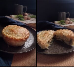 (Below) This years BRAND NEW allergy friendly Roast Celeriac, shitake and button mushroom pie with a sage creme sauce . Comes with cranberry and merlot sauce, vegetables are seperate. GF/SF/NF/Vegan